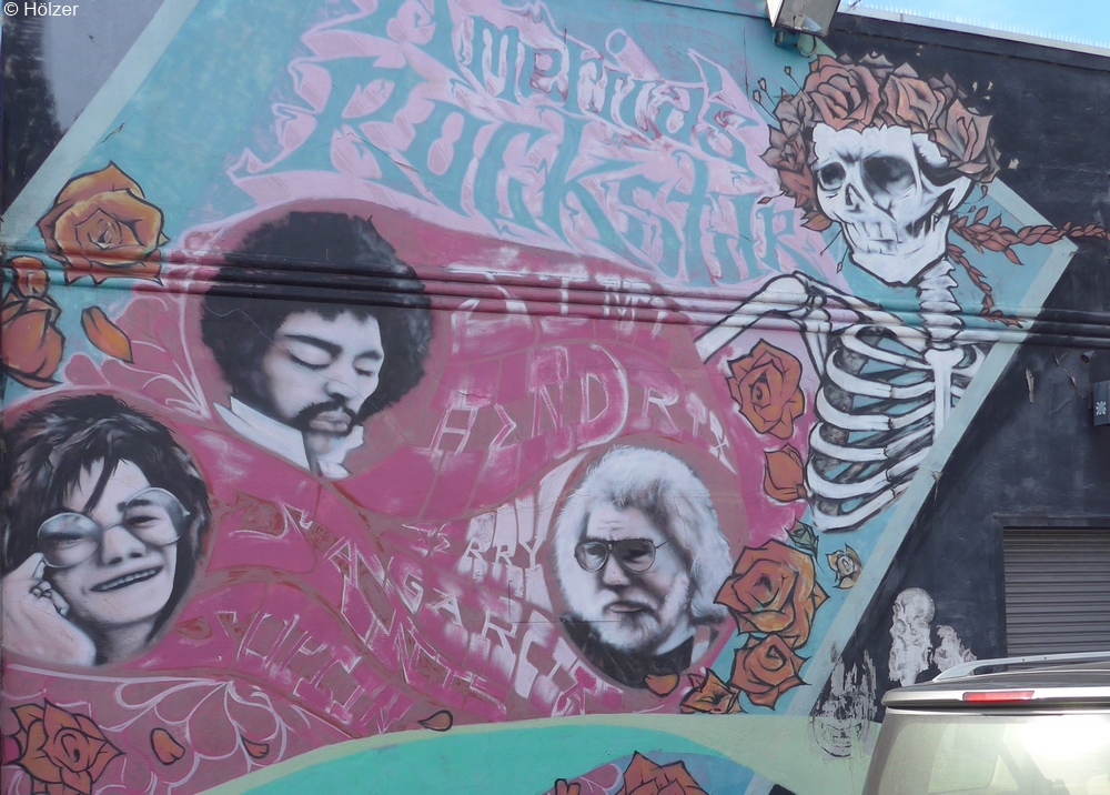Auf diesem Wandgemälde ist neben Jerry Garcia auch Janis Joplin und Jimi Hendrix abgebildet. Den Totenkopf findet man im Original auf dem Plattencover einer Grateful Dead LP aus dem Jahr 1971.