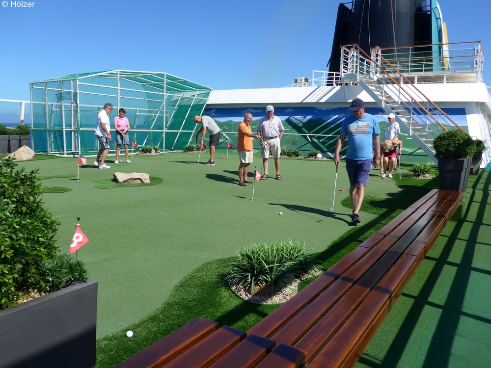 Golf und Seegang sind eigentlich kontraproduktiv. Man schlägt den Ball und kurz bevor er in das Loch kullert, sorgt bereits ein ganz leicht schwankendes Schiff dafür, dass der Ball zum Golfer zurück rollt oder plötzlich einen Bogen schlägt statt einzulochen.